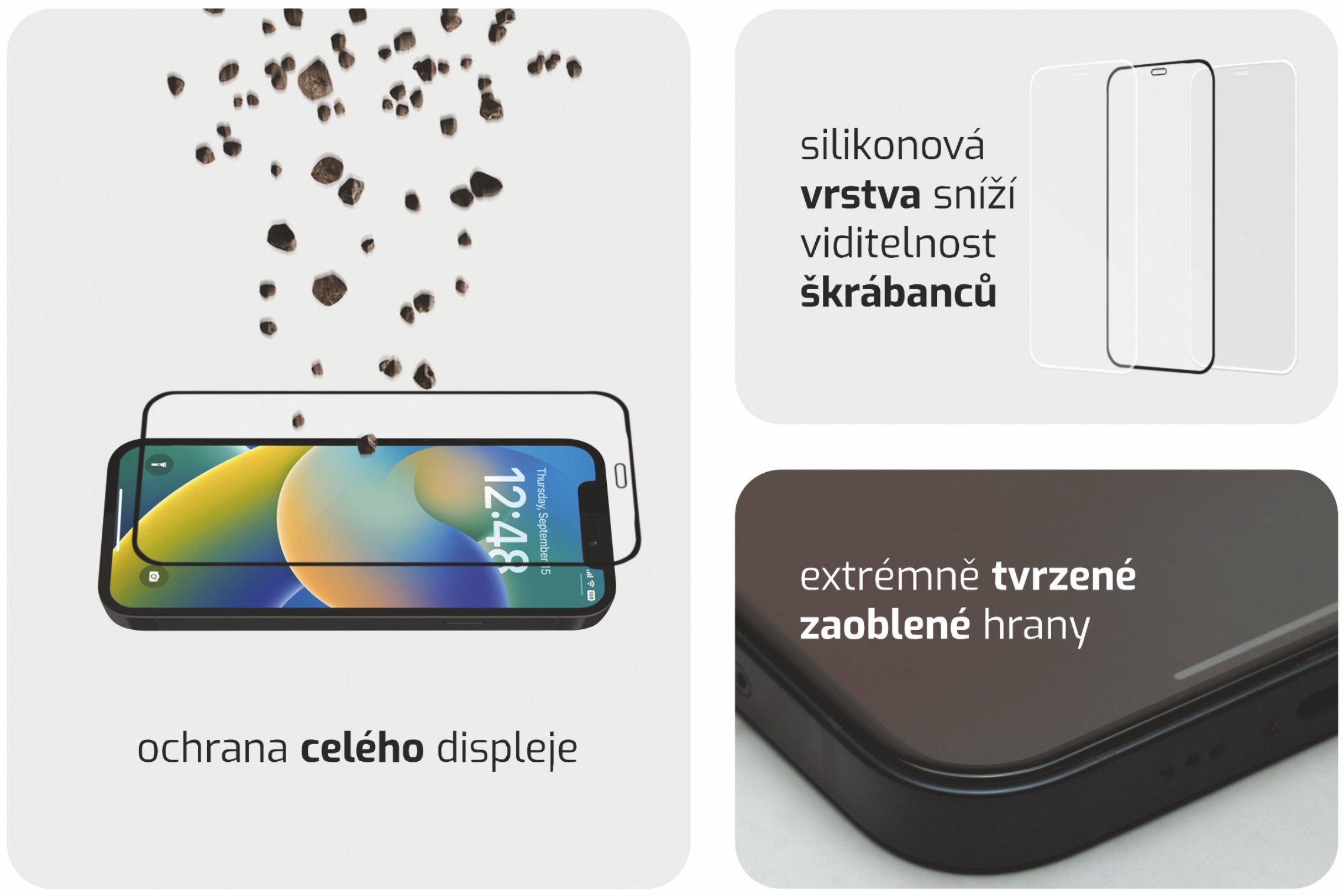 Ochranné temperované sklo s velkou pevností ochrání displej smartphonu proti poškrábání a menším až středním pádům. Okraj skla má extrémně tvrzené zaoblené hrany, díky nimž se výrazně zvýší odolnost při pádu smartphonu na hranu displeje, ale také se prodlouží i životnost samotného skla.