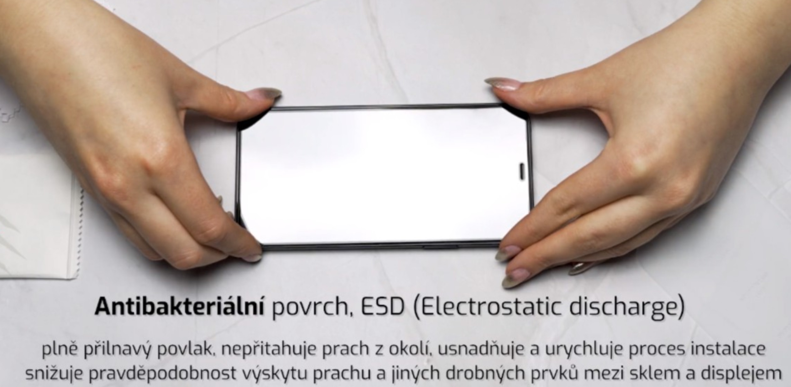 ESD (Electrostatic discharge) je nejlepší plně přilnavý povlak, který nepřitahuje prach z okolí. Povlak usnadňuje a urychluje proces instalace a také snižuje pravděpodobnost výskytu prachu a jiných drobných prvků mezi sklem a displejem. Součástí balení skla je i sada pro snadnou aplikaci skla na smartphone. Vlhký hadřík pro odmaštění a zbavení nečistot z displeje smartphonu spolu se suchým hadříkem dokonale displej vyčistí a připraví snadné nalepení. A samolepky pro odstranění prachových částic v případě, že by se dostaly pod lepené sklo. Díky lepící vrstvě ESD skla a čístící sadě se daří sklo nalepit krásně bez bublin. Silikonová lepící vrstva navíc sníží viditelnost případných škrábanců na použitém smartphonu.